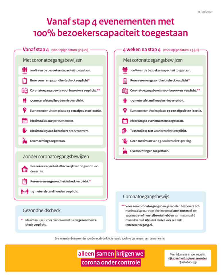 Het kabinet heeft bekend gemaakt versoepelingen door te voeren per eind juni, waardoor het zomerseizoen voor de evenementen die nog gepland staan grotendeels door kan gaan. Op basis van de onderzoeksresultaten van Fieldlab Evenementen wordt hiermee het Nationaal Evenementenplan, dat rond 1 februari door de sector gelanceerd werd, gerealiseerd. Concreet betekent het dat bij gebruik van Testen voor Toegang alle evenementen weer mogelijk worden. Hierbij wordt het zelfs met 100% van de bezoekerscapaciteit mogelijk om de 1,5 meter afstand los te laten.