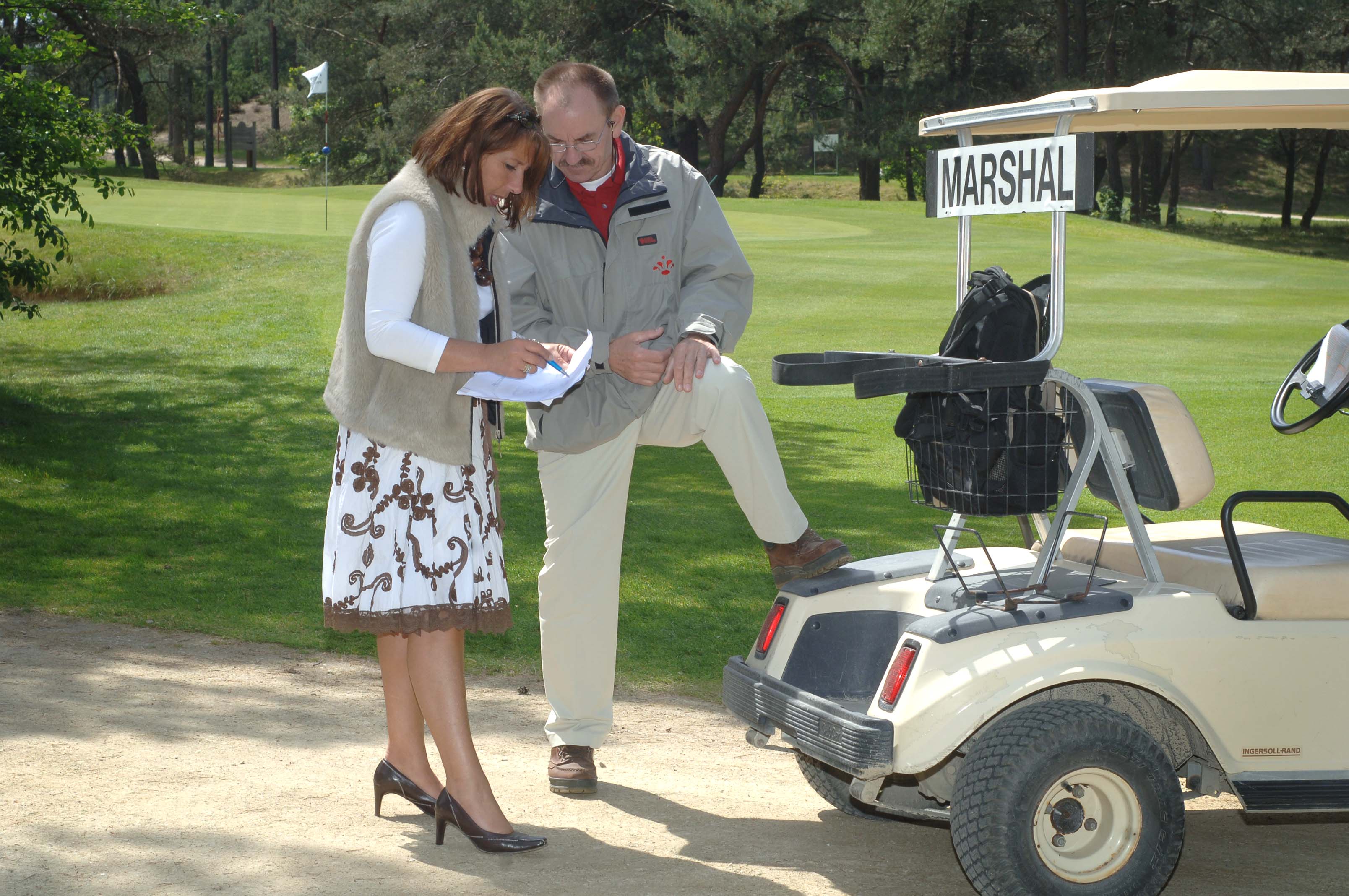 De wedstrijd startte na de lunch met een shotgun. Iedere flight kreeg, naast een eigen gastheer of -dame, een golfpro mee, die hen tijdens 9 holes van tips voorzag. Het was geen officiële wedstrijd, dus dan mag dat en er werd via het zogenaamde “best-ball“-principe gespeeld, om op die manier al minder individueel door de baan te gaan. De flights waren niet ingedeeld op basis van handicap, maar op basis van de 20 kantoren waar de deelnemers van advies voorzien werden. In iedere flight liep een vertegenwoordiger van het betreffende kantoor. Tijdens de wedstrijd reed ik in een golfkarretje met de marshall en een professionele fotograaf rond en werd iedere flight op de gevoelige plaat vastgelegd. Deze foto werd hen een week later, voorzien van een persoonlijk berichtje door de betreffende gastheer of –dame, als aandenken toegestuurd.